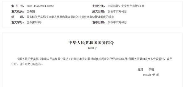 2024年7月1日,国务院总理李强签署国务院令,公布《国务院关于实施〈中华人民共和国公司法〉注册资本登记管理制度的规定》,自公布之日起施行。